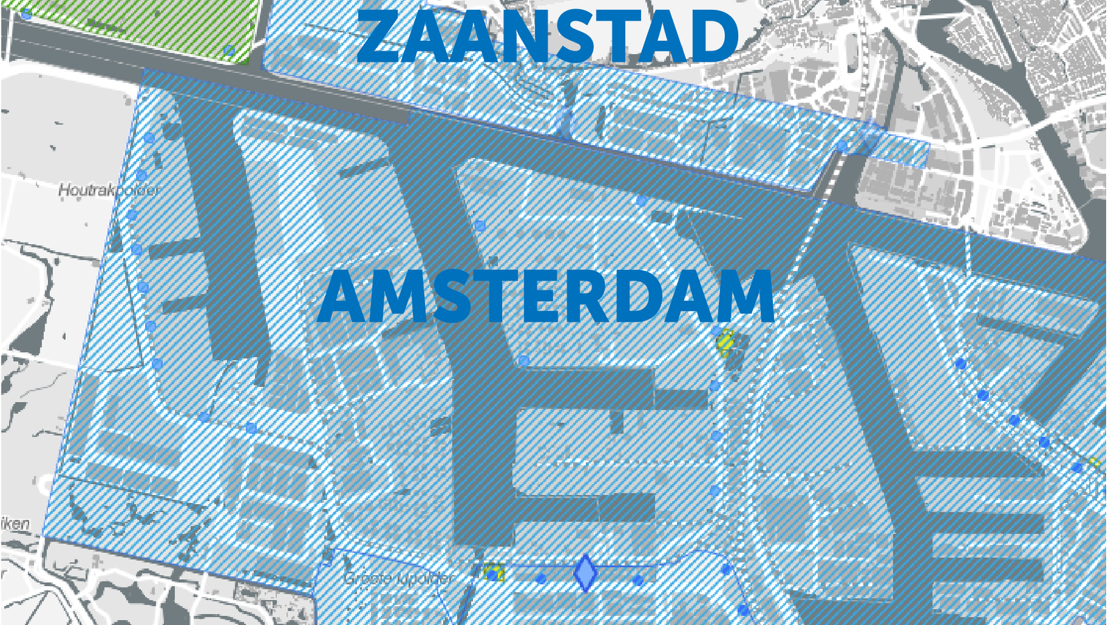 De zoekgebieden van Zaanstad en Amsterdam zoals die in de RES Viewer staan. Wil je de RES Viewer bekijken? Klik dan hier.