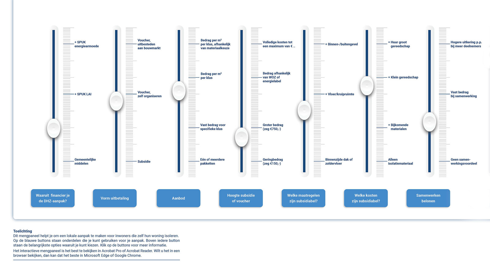 Dit mengpaneel helpt je om een lokale aanpak te maken voor inwoners die zelf hun woning isoleren. Op de blauwe buttons staan onderdelen die je kunt gebruiken voor je aanpak. Boven iedere button staan de belangrijkste opties waaruit je kunt kiezen. Klik op de buttons voor meer informatie. Het interactieve mengpaneel is het best te bekijken in Acrobat Pro of Acrobat Reader. Wilt u het in eenbrowser bekijken, dan kan dat het beste in Microsoft Edge of Google Chrome.