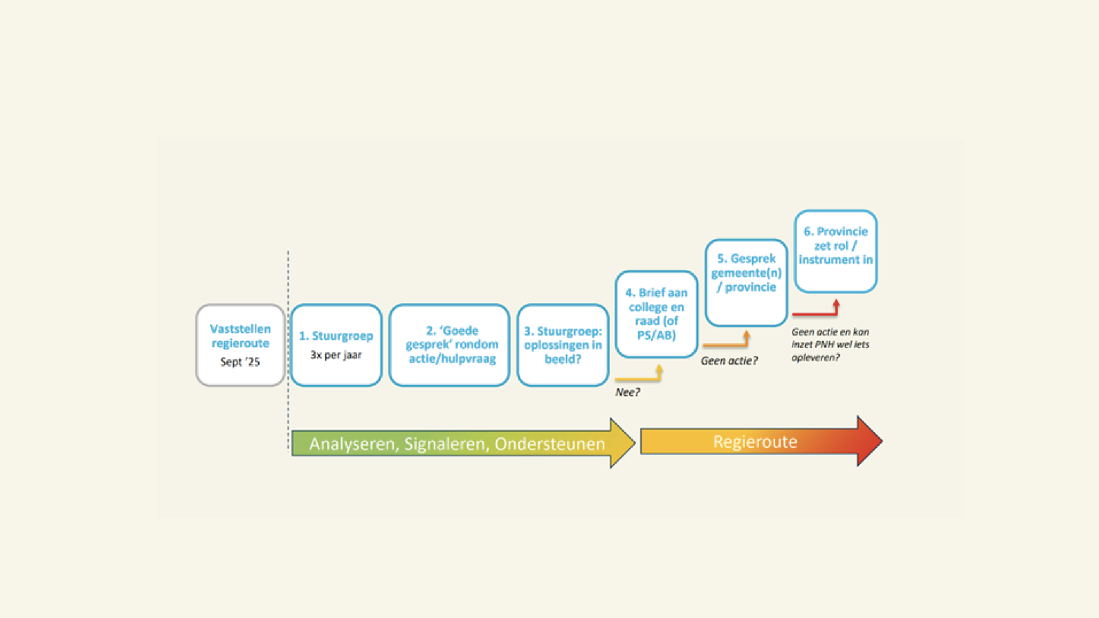 Op basis van deze gegevens beoordeelt de stuurgroep of actie nodig is. Er zijn twee situaties waarin de Regieroute kan worden ingezet: